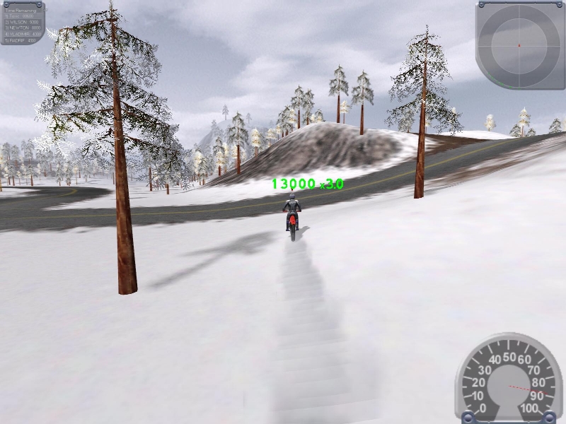 Me and Jeff assembled for a night of Friday Night Gaming with just the two of us. We have been playing Bear Mountain on Motocross Madness 2. We had typically been using the ski jump, but I had found a new hill that gave some seriously fun air. Jeff took a little different angle off the hill and it was perfect. Long jumps, big air, major hang time, and a lot of practice made for a good time to be had by all. Jeff posted a 12,000x3 trick. I had barely started being able to DO 3 multiplier tricks and landed a 12,500x3 trick. It was amazing seeing how much air we were getting. Seeing it from the third person perspective showed how high and how far we were really flying. I subsequently got about 4 or 5 more 12,500x3 tricks, but kept forgetting to screenshot them. I stayed up 'til 5:45 in the morning playing and practicing, long after Jeff had gone to bed, and posted a 13,000x3 trick, which I have been unable to duplicate (but I have landed two 12,900x3 tricks). My high score was 563,000 or so, but I have yet to reach Jeff's high score of 588,000. Let the games continue!