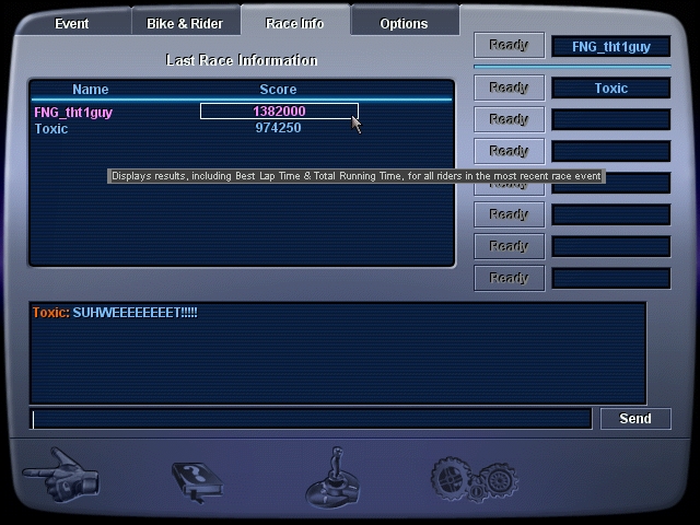 Afterward, it was on to more racing, until 2:45am, when we finally were pried from our gamepads by the overshadowing cloud of sleep. It was a great time with neck-and-neck racing all around, and some sik air. If you don't own the game yet, d/l the trial and get hooked. Then see our FAQ section for where to get hold of your own retail version.